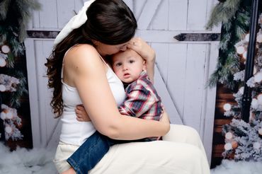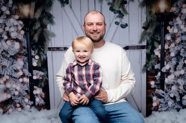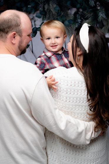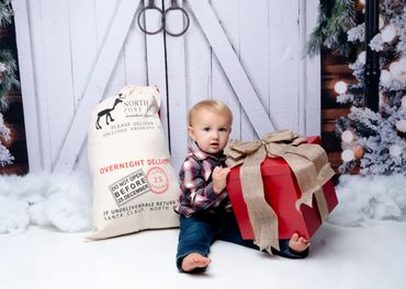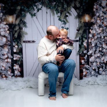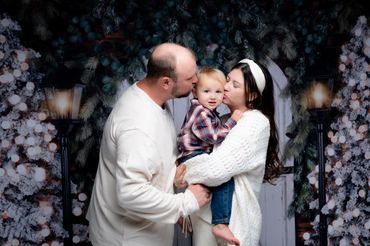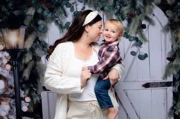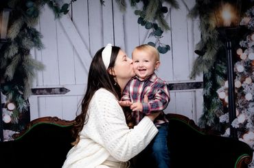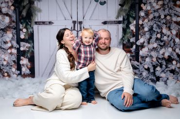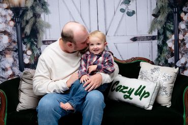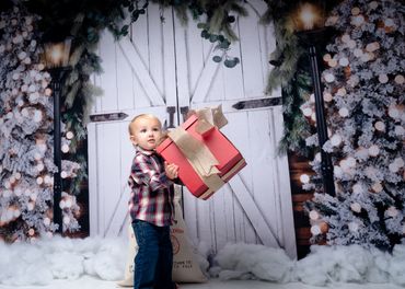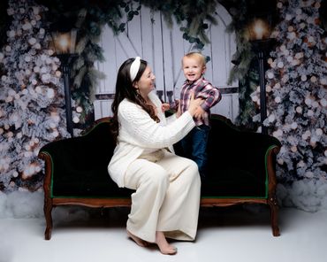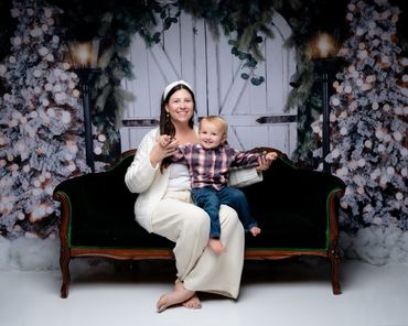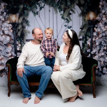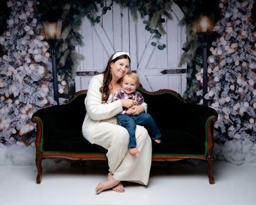 This year’s Christmas mini sessions feature a classic winter scene with snowy trees, glowing lanterns, and a rustic set of white barn doors draped in evergreens. A velvet green couch adds a touch of sophistication, making this the perfect setting for families who prefer a more formal look for their holiday cards.